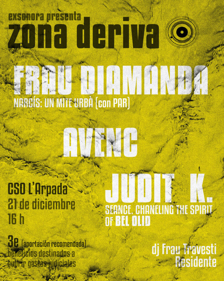 El domingo 21 de diciembre, a las 16h, Frau Diamanda (junto con PAR) y AVENC, acompañarán a Judit K. en una tarde de performance, ruido y palabra organizada por Exsonora.